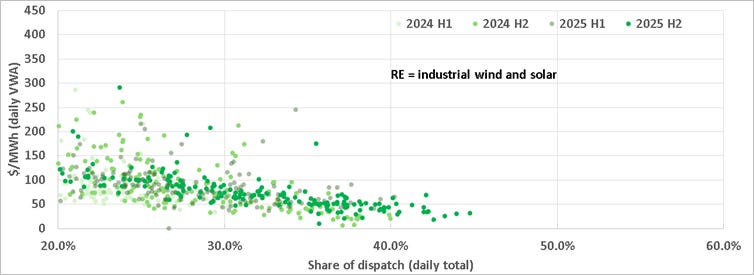The pair used another price vs share correlation to claim that gas-fired generation played a lower role in price setting in 2025.
