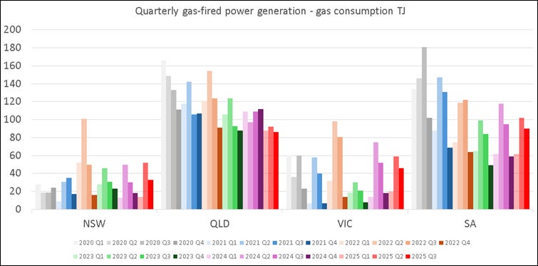 This is flat out wrong as shown by the price-setting data presented earlier. In NSW gas set the price 40% more often in 2025 than in 2024. While total gas consumption for power generation is trending down in QLD the picture is more complex in other regions and even trending up in VIC, NSW and SA.