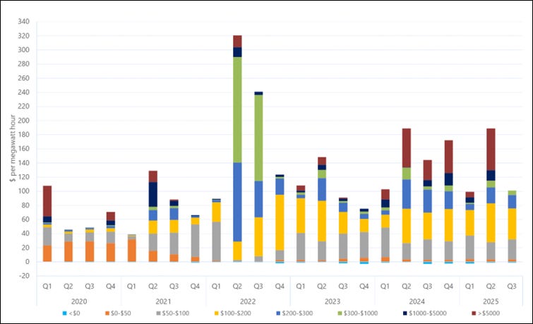 In contrast the price bands above $100/MWh have a much greater impact on the quarterly average price. High prices almost always occur when grid generation is high during peak demand periods. High $/MWh x high MWh = a large number and large effect on quarterly average price.
