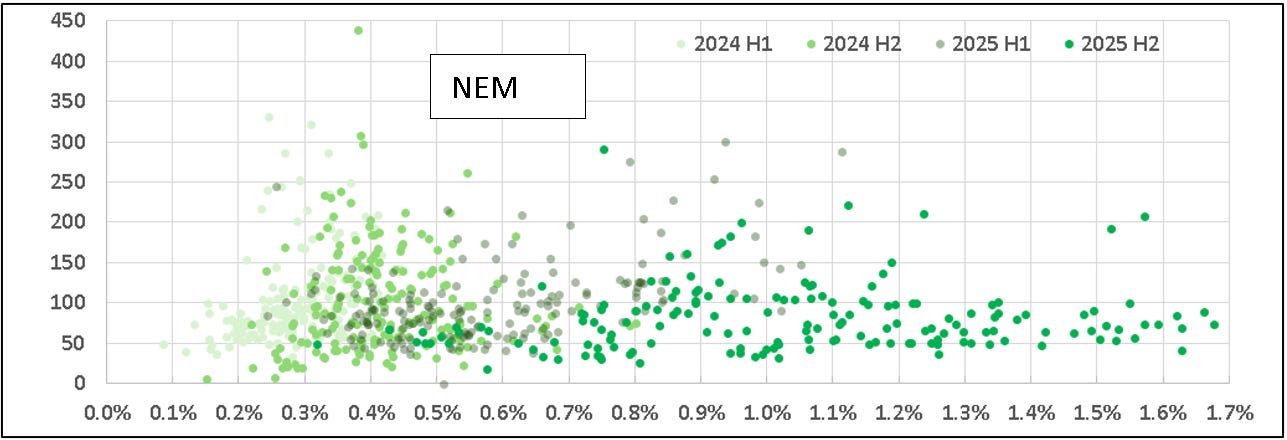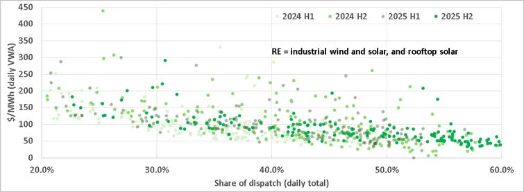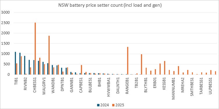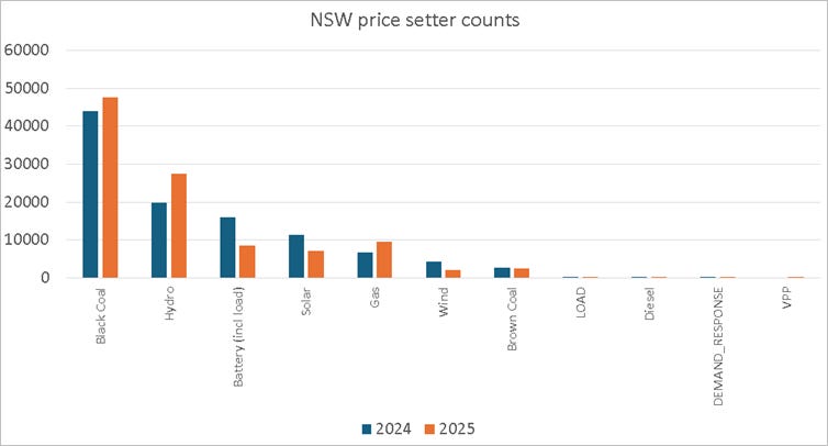 But they fail to say why. Their thesis is simply ‘more RE/battery means lower prices’. To verify that claim they should be able to show exactly how ‘more RE’ makes the wholesale market set at a lower price. We’ve already seen the price setter data which shows fewer prices set by batteries and more by coal for lower prices in 2025.