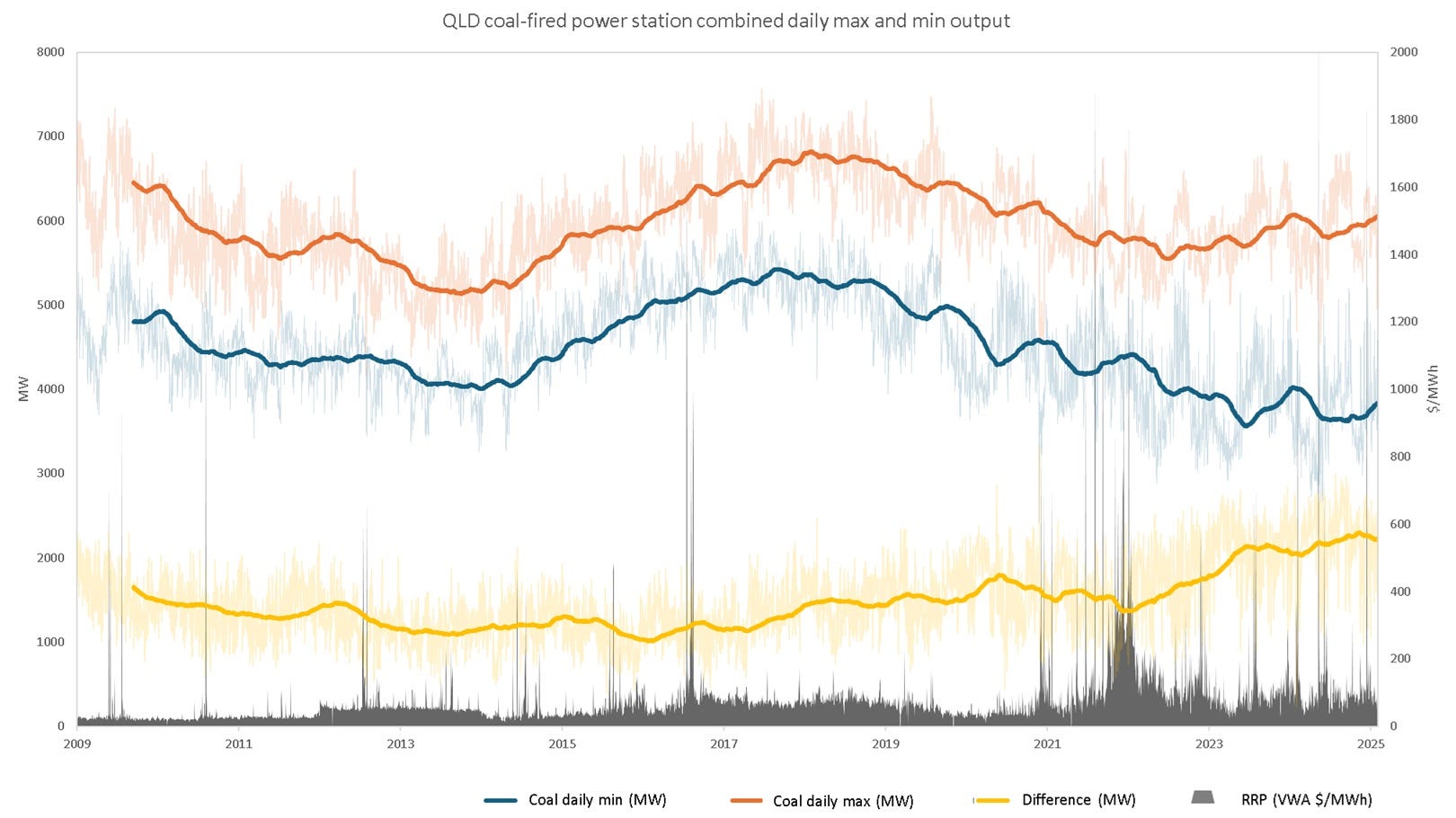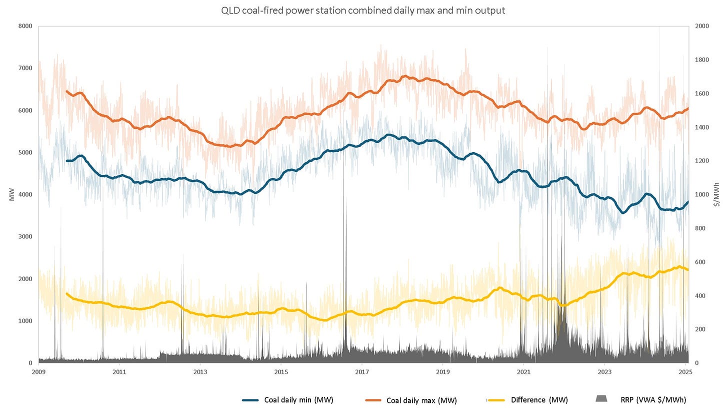 In the QLD data presented here there are 34 days when the daily minimum coal output breached 3,000 MW, and 30 of those occurred in 2024/25.