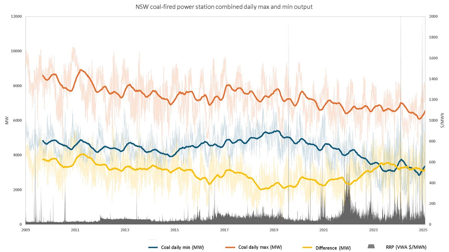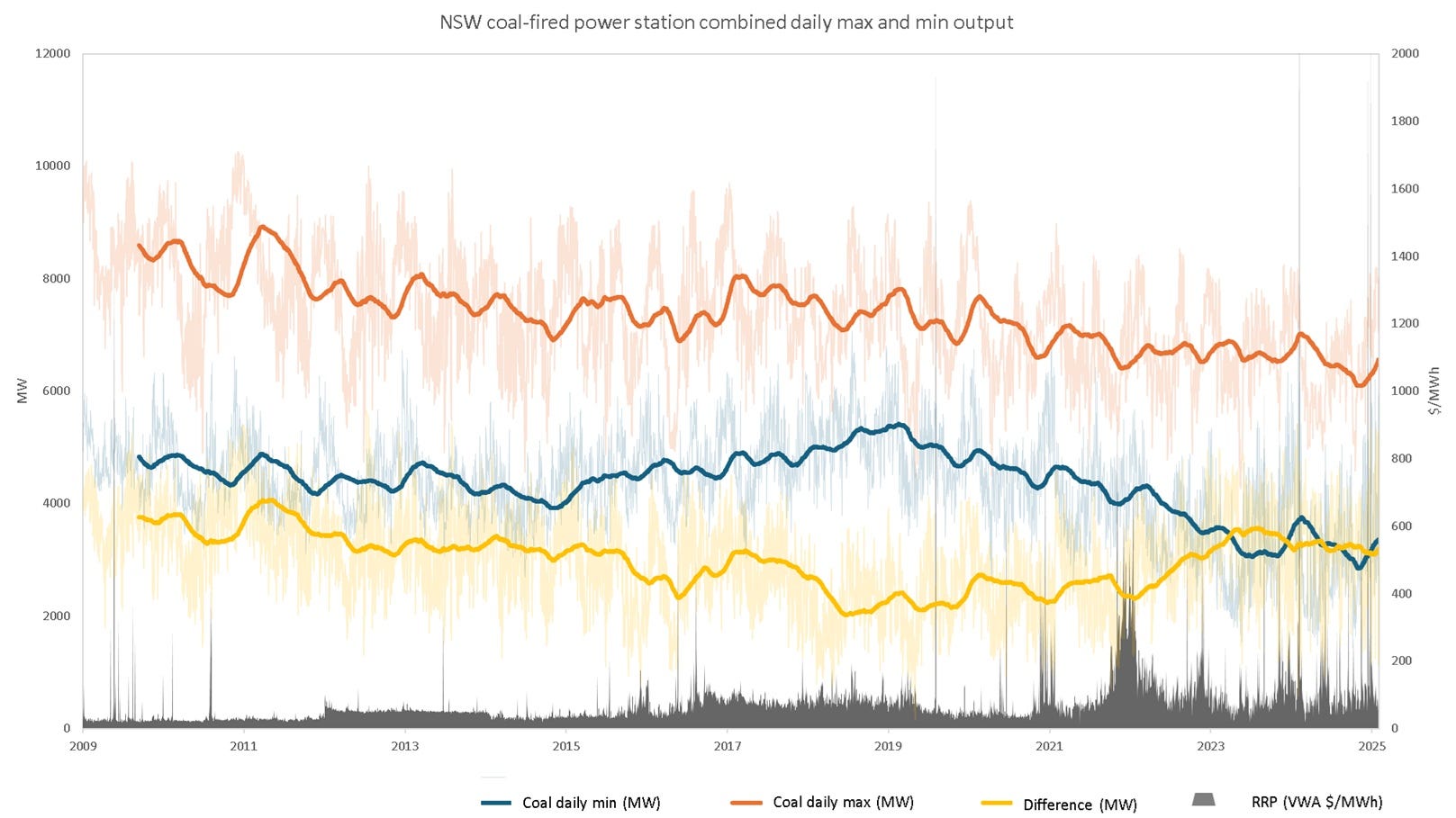 I put these two charts together because I was curious about the divergence of combined max and min output for coal-fired power in QLD and NSW. Is the maximum going up or down? Is the minimum going up or down? How can it be presented nicely (most important part :P).